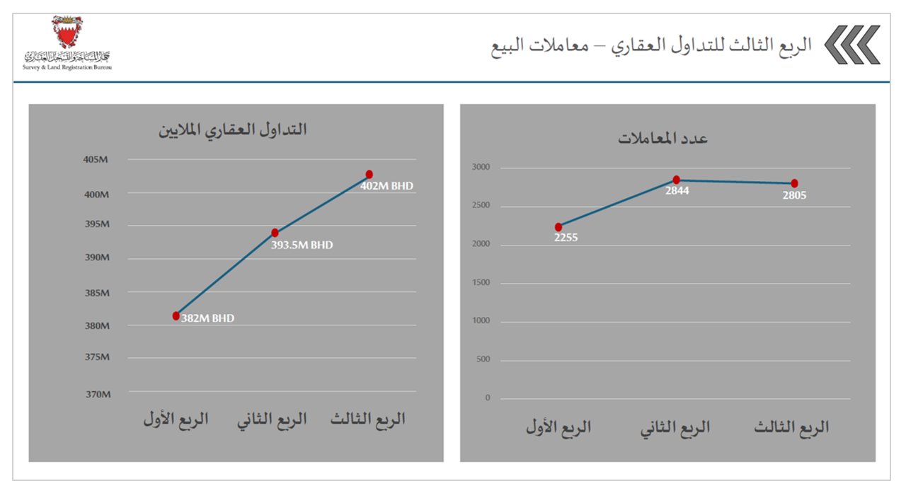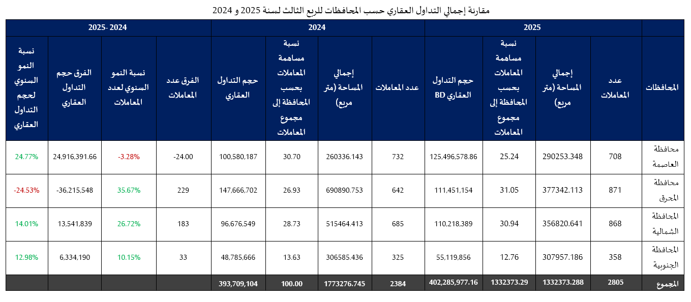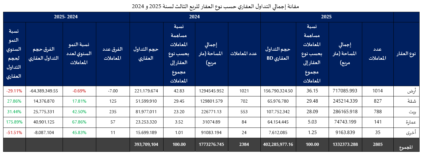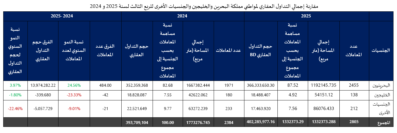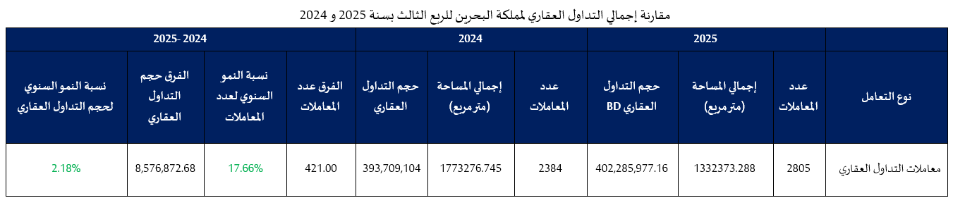 مقارنة إجمالي التداول العقاري لمملكة البحرين للربع الثالث بسنة 2025 و 2024